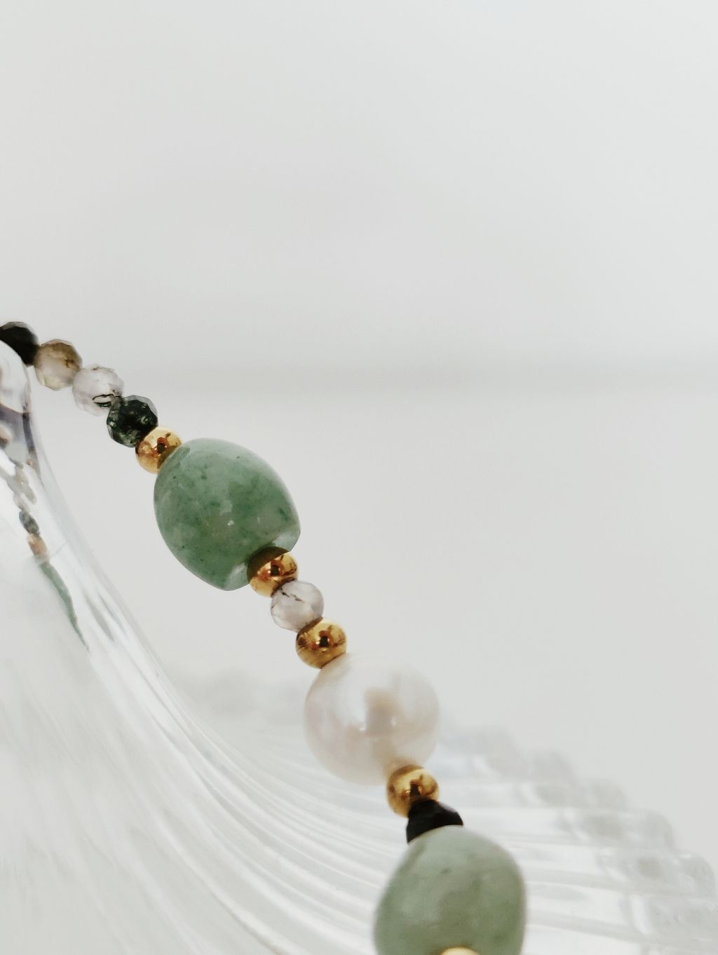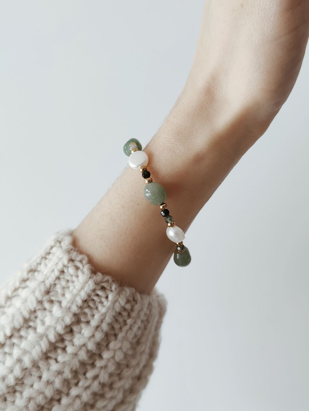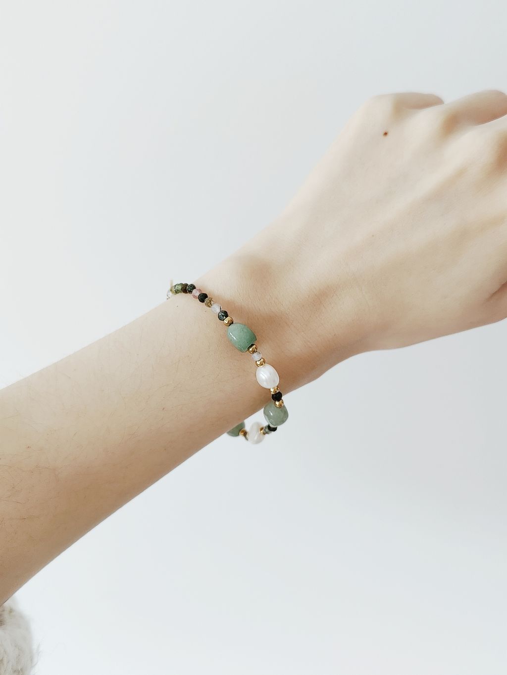 材質:海藻玉、東陵玉、0.8公分淡海珍珠、鋼鍍金