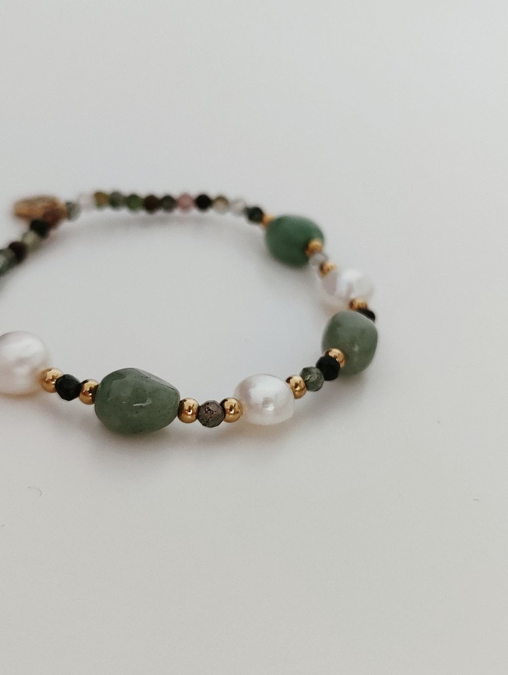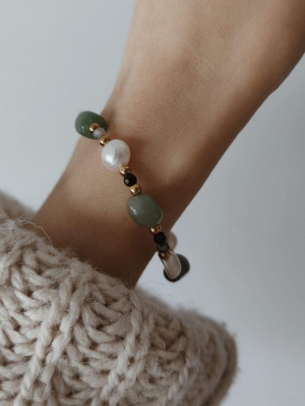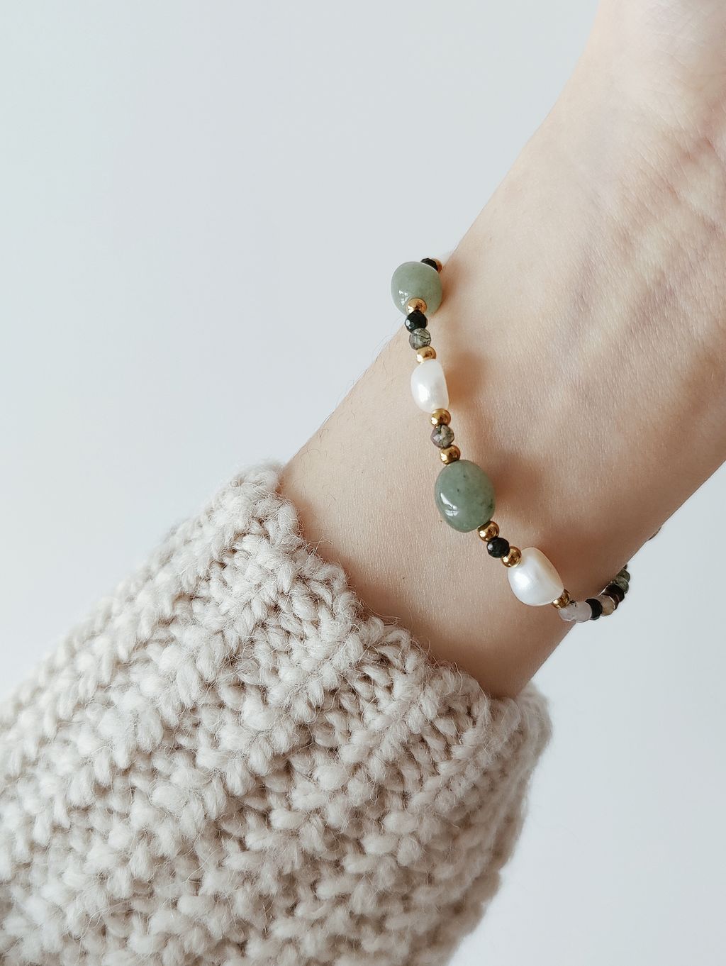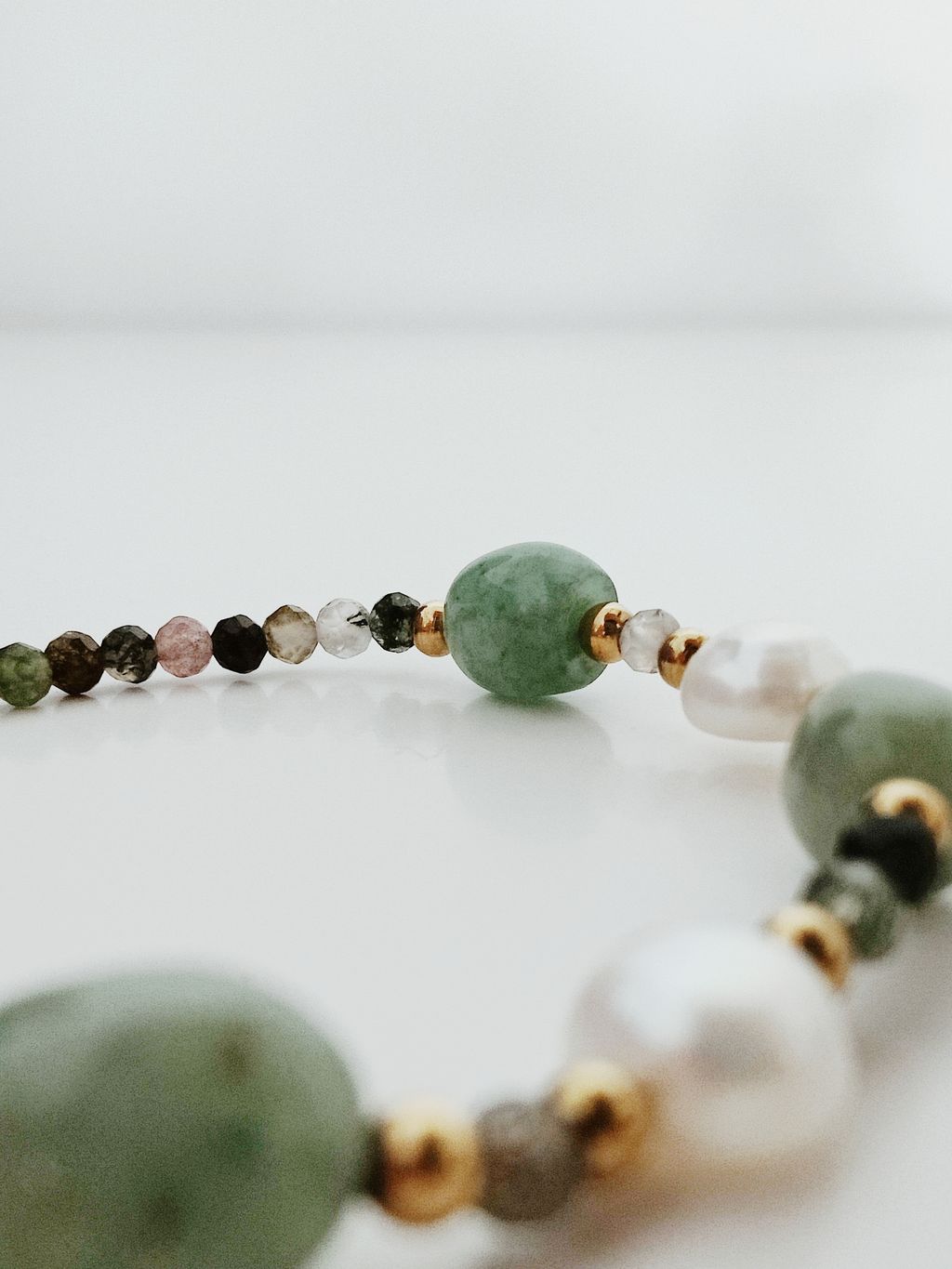 材質:海藻玉、東陵玉、0.8公分淡海珍珠、鋼鍍金